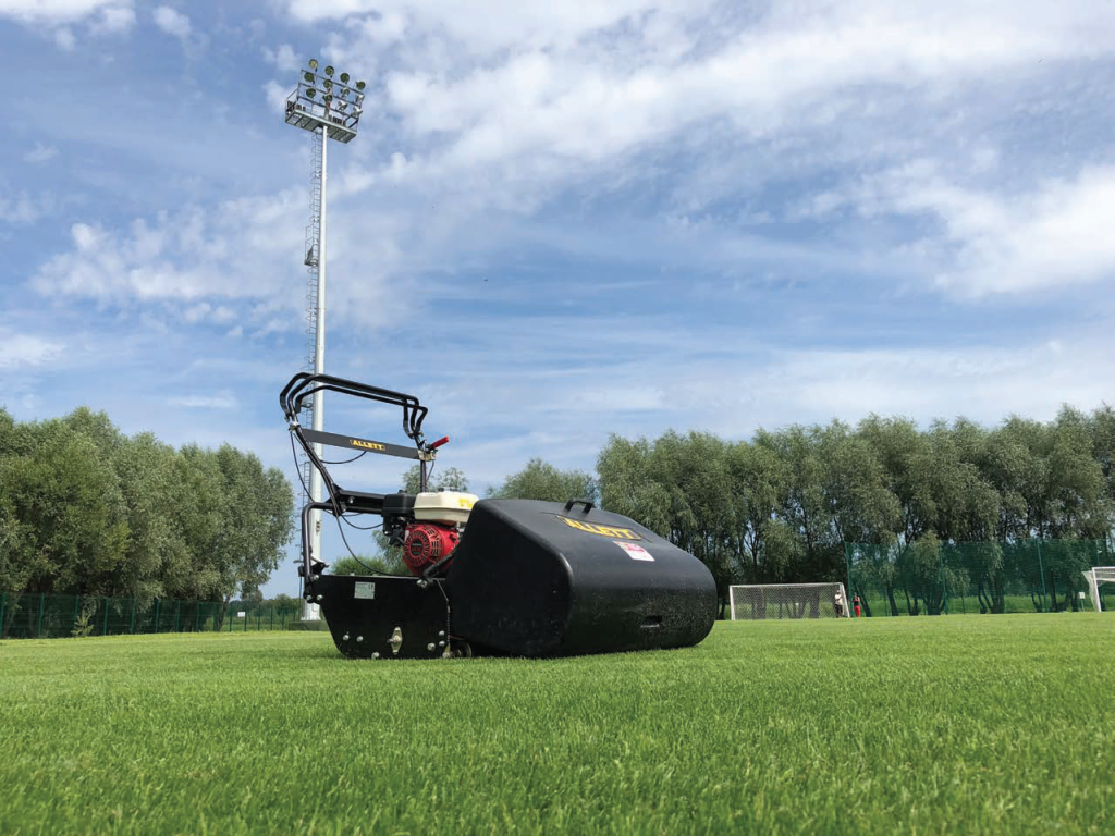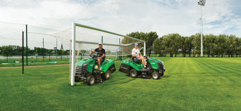 На полях в Бронницах черновую стрижку проводят газонокосильными машинами и роторными газонокосилками Caiman c задним прижимным роликом. Вращающийся нож создает мощный вихревой поток, удаляющий с поверхности избыток песка.